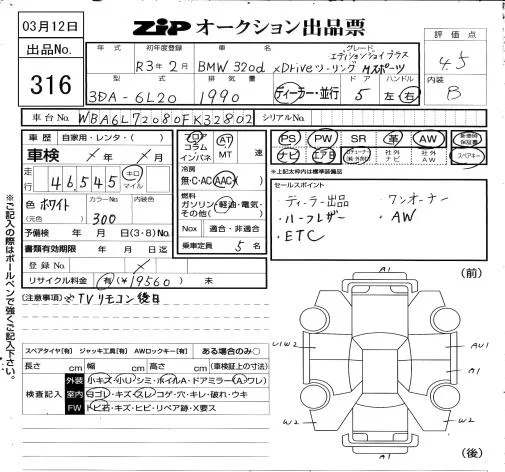 BMW 3-Series с аукциона Японии ZIP Osaka лот № 316