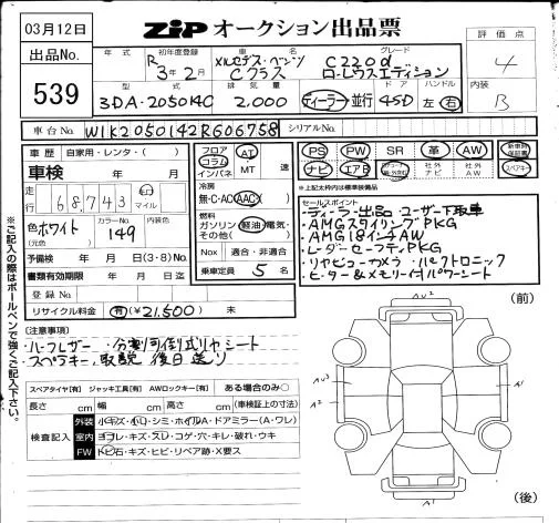 Mercedes-Benz C CLASS с аукциона Японии ZIP Osaka лот № 539