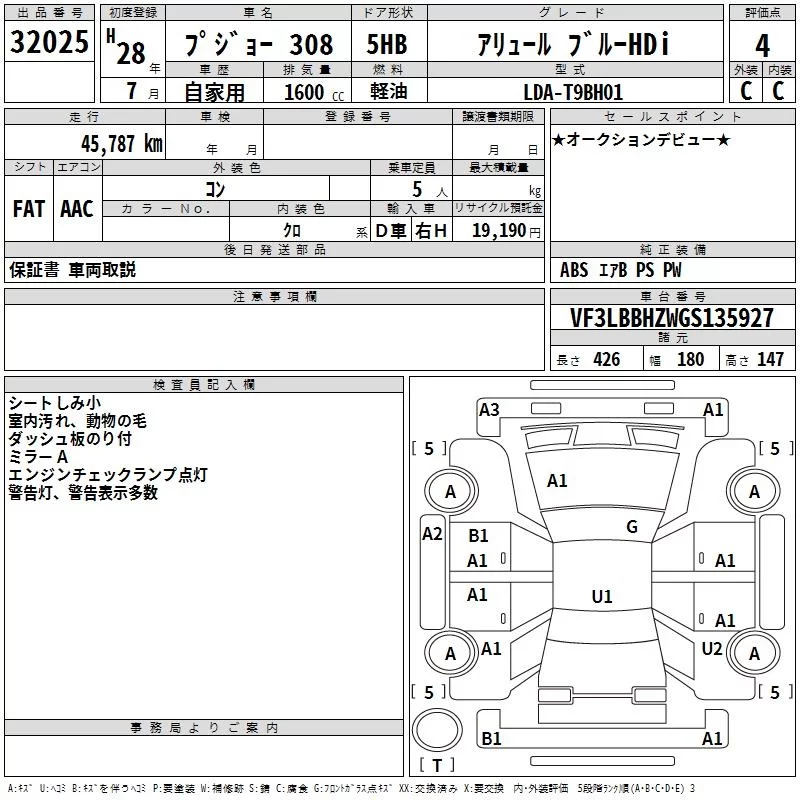 Peugeot 308 с аукциона Японии TAA Kanto лот № 32025