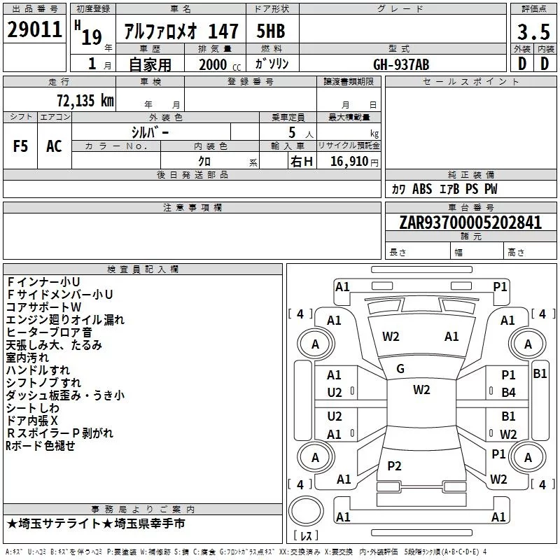 Alfa Romeo 147 с аукциона Японии TAA Kanto лот № 29011