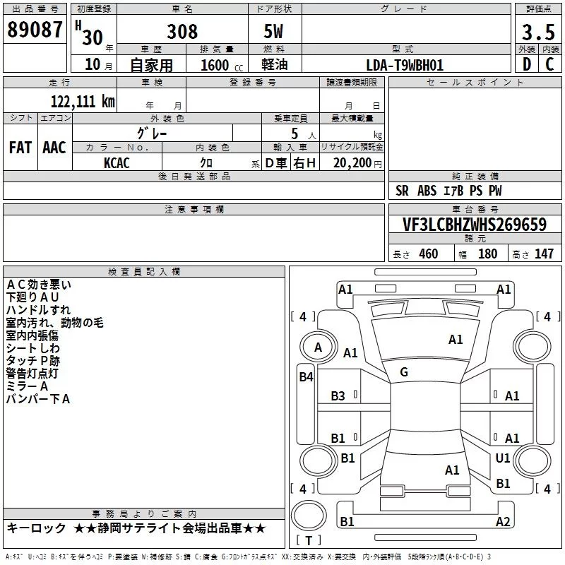 Peugeot 308 с аукциона Японии TAA Chubu лот № 89087