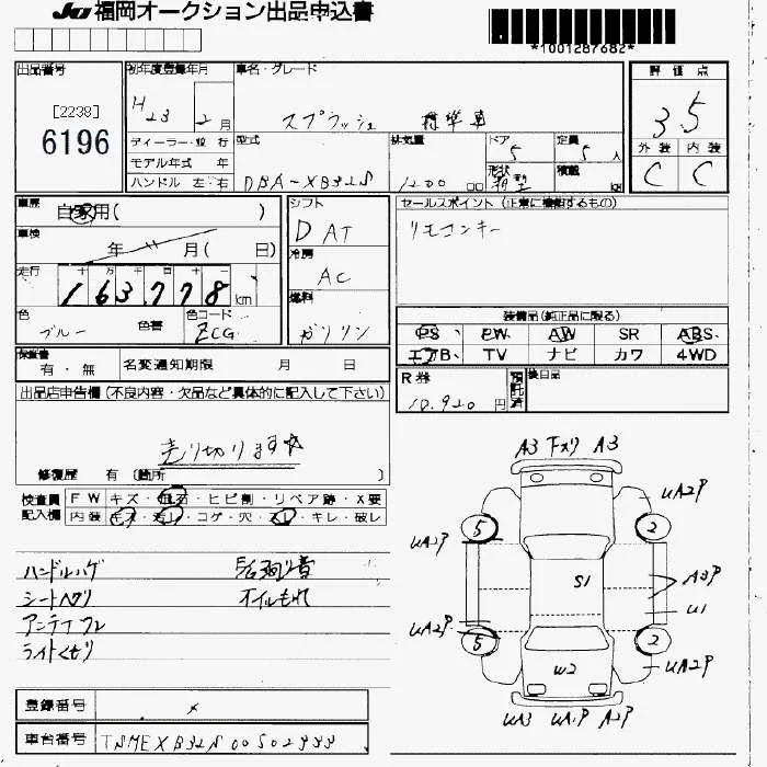 Suzuki SPLASH с аукциона Японии JU Fukuoka лот № 6196