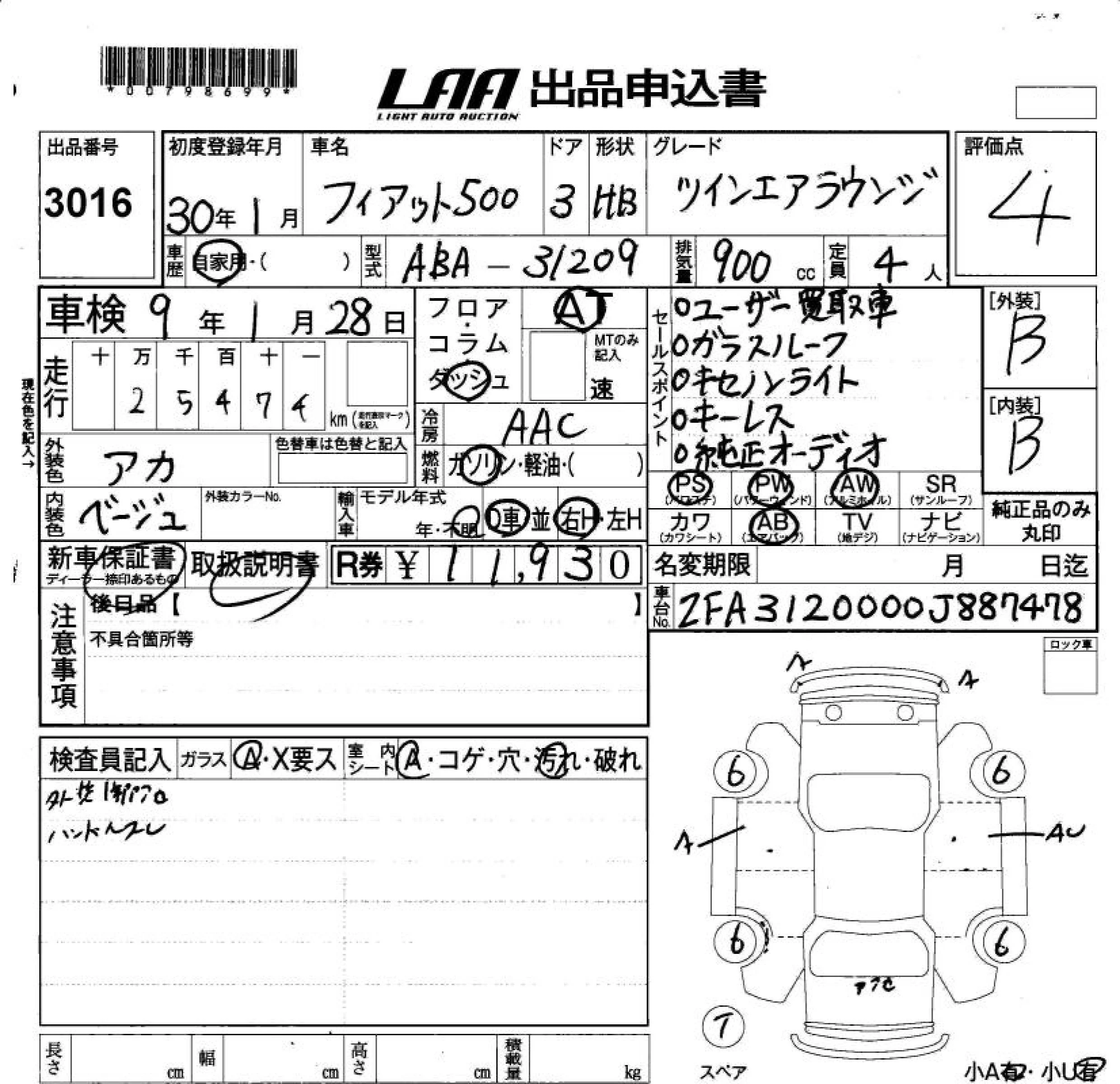 Fiat 500 с аукциона Японии LAA Okayama лот № 3016