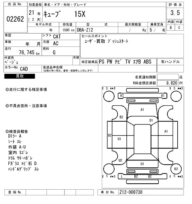 Nissan CUBE с аукциона Японии ARAI Bayside лот № 2262