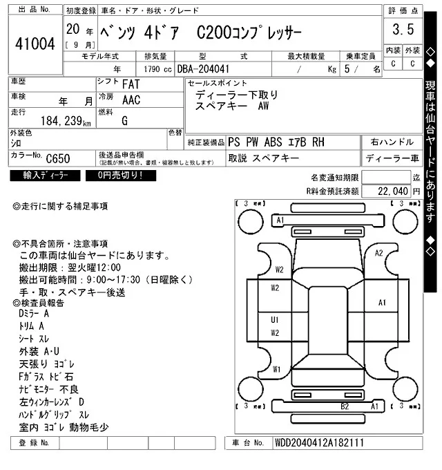 Mercedes-Benz C CLASS с аукциона Японии ARAI Bayside лот № 41004