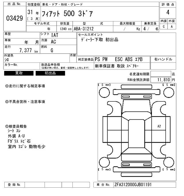 Fiat 500 с аукциона Японии ARAI Bayside лот № 3429