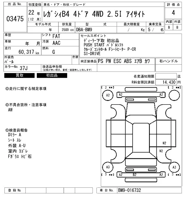 Subaru LEGACY B4 с аукциона Японии ARAI Bayside лот № 3475