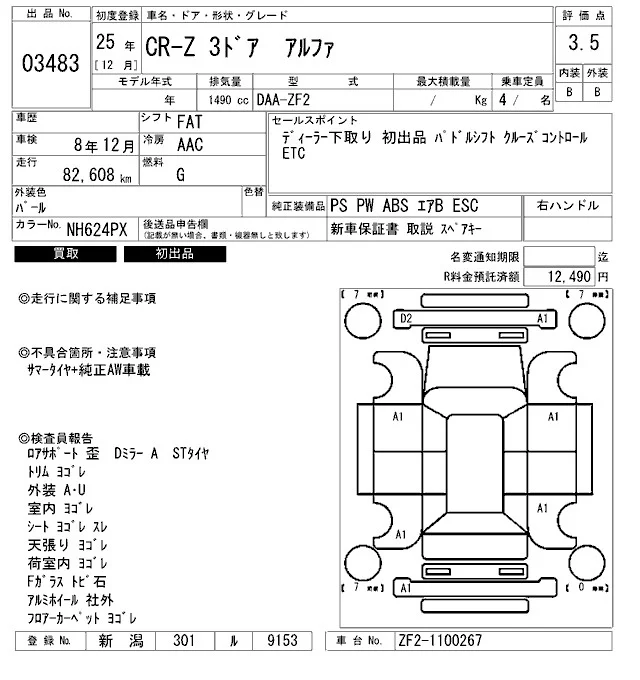 Honda CR-Z с аукциона Японии ARAI Bayside лот № 3483
