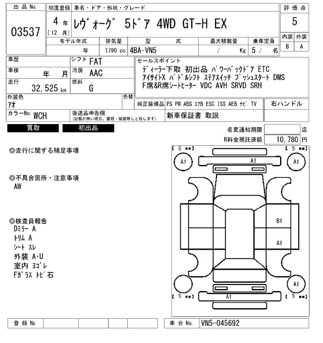 Subaru LEVORG с аукциона Японии ARAI Bayside лот № 3537