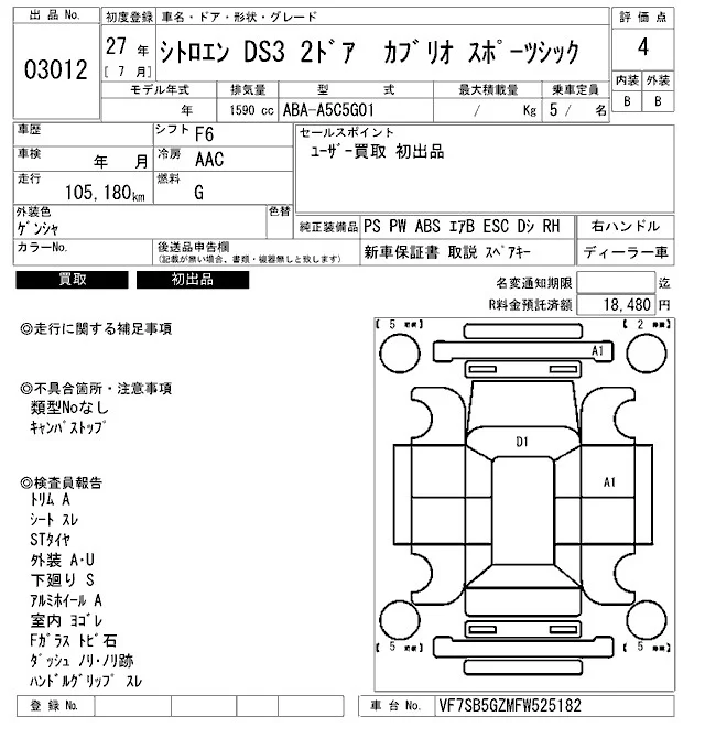 Citroen DS3 с аукциона Японии ARAI Bayside лот № 3012
