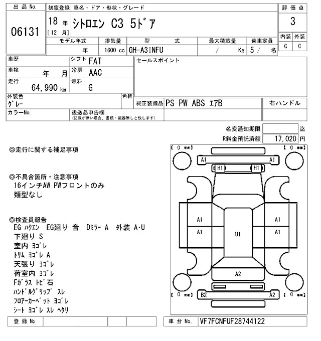 Citroen C3 с аукциона Японии ARAI Sendai лот № 6131