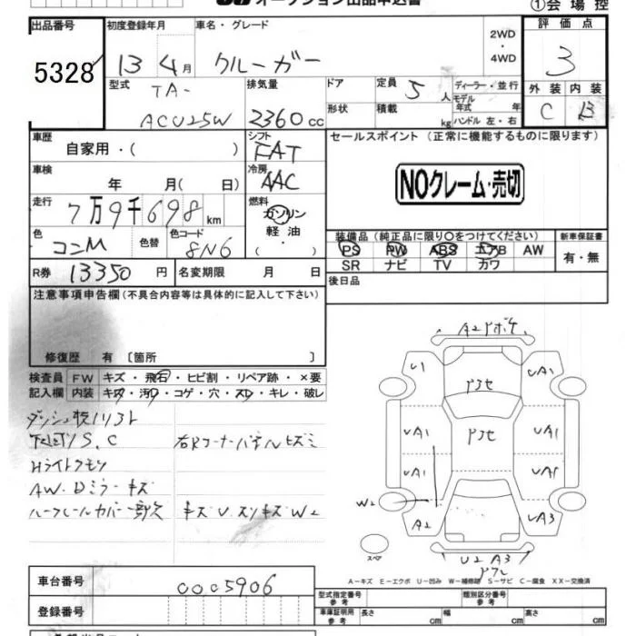 Toyota KLUGER с аукциона Японии JU Chiba лот № 5328
