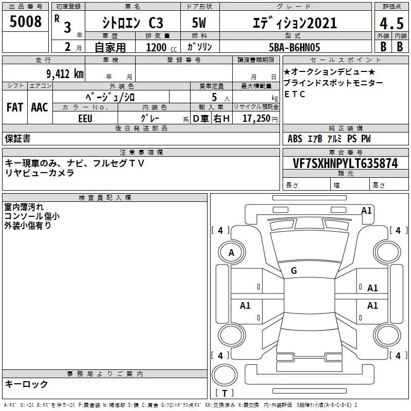 Citroen C3 с аукциона Японии TAA Yokohama лот № 5008