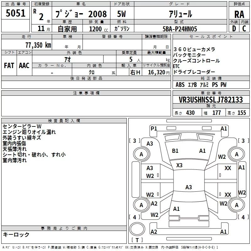 Peugeot 2008 с аукциона Японии TAA Yokohama лот № 5051