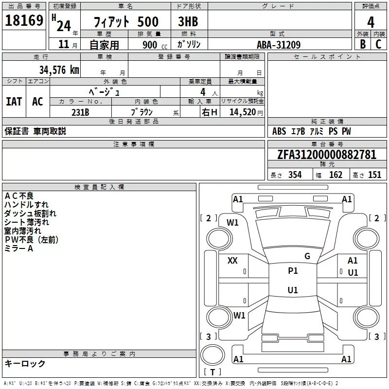 Fiat 500 с аукциона Японии TAA Yokohama лот № 18169