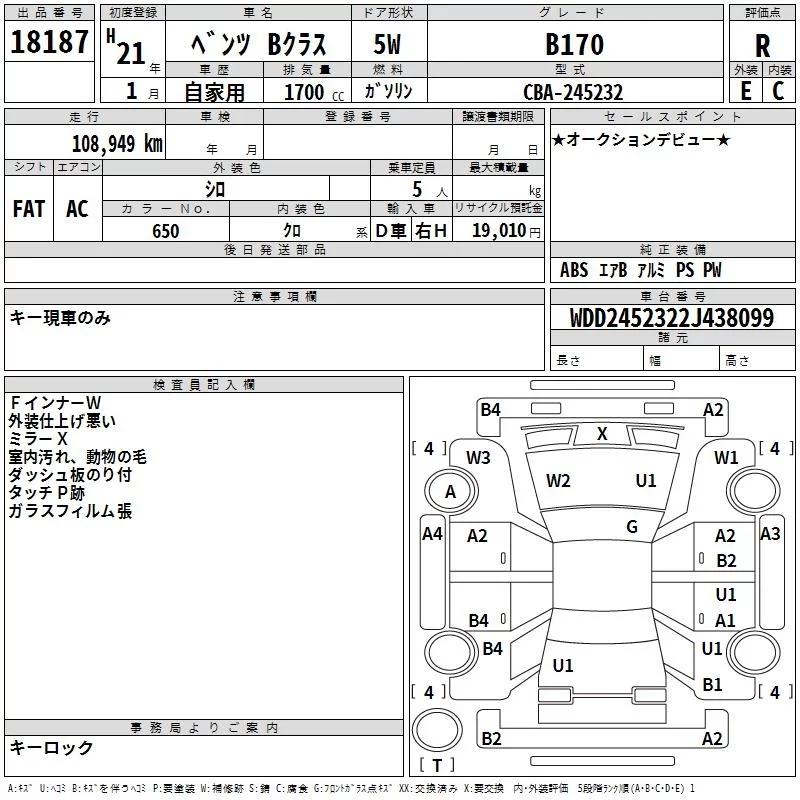 Mercedes-Benz B CLASS с аукциона Японии TAA Yokohama лот № 18187