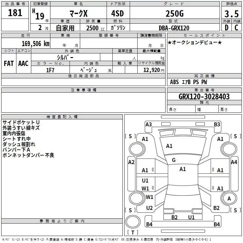 Toyota MARK X с аукциона Японии TAA Hyogo лот № 181