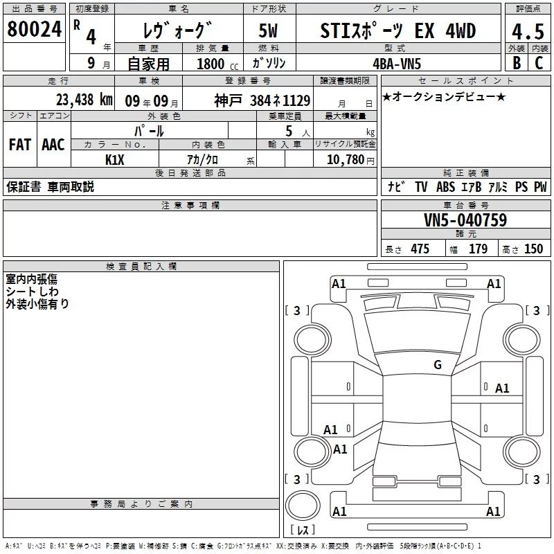Subaru LEVORG с аукциона Японии TAA Hyogo лот № 80024