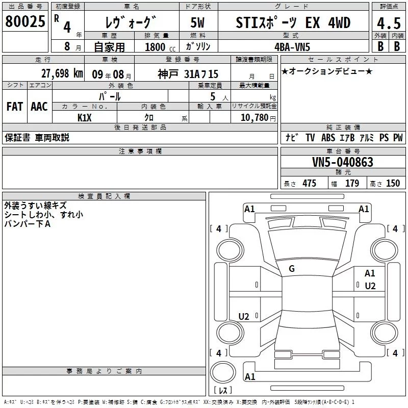 Subaru LEVORG с аукциона Японии TAA Hyogo лот № 80025