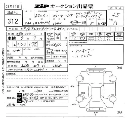 Renault Arkana с аукциона Японии ZIP Tokyo лот № 312