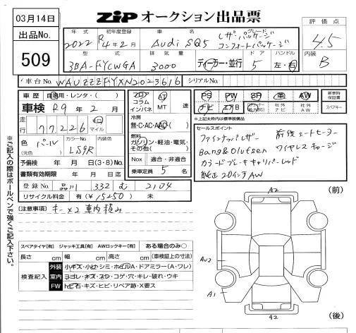 Audi SQ5 с аукциона Японии ZIP Tokyo лот № 509