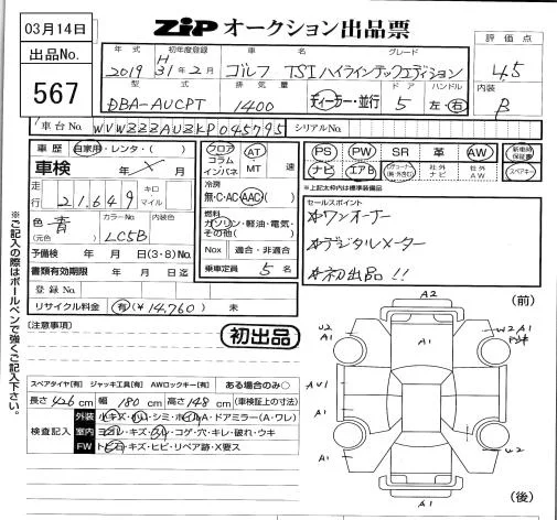 Volkswagen GOLF с аукциона Японии ZIP Tokyo лот № 567