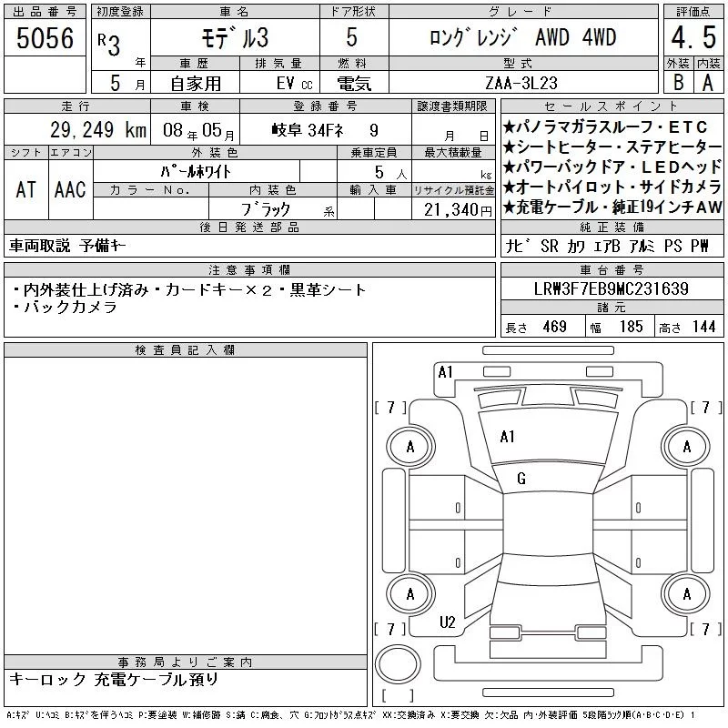 Tesla MODEL3 с аукциона Японии CAA Gifu лот № 5056