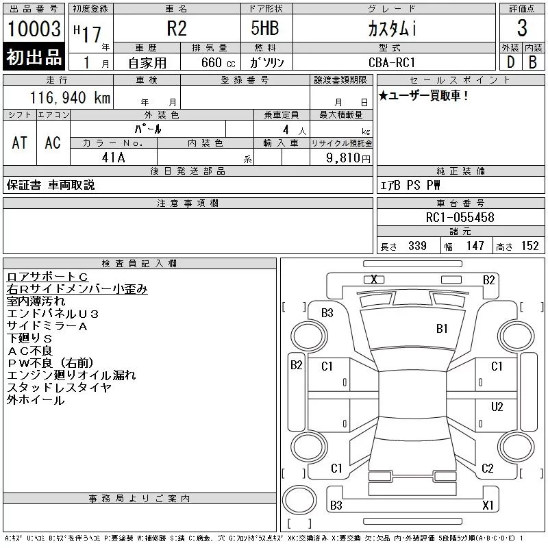 Subaru R2 с аукциона Японии CAA Gifu лот № 10003