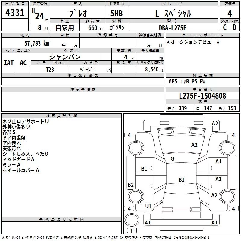 Subaru PLEO с аукциона Японии TAA Shikoku лот № 4331