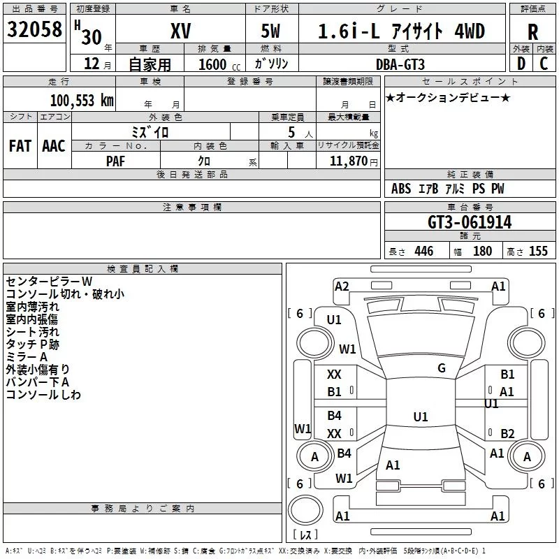 Subaru XV с аукциона Японии TAA Kinki лот № 32058