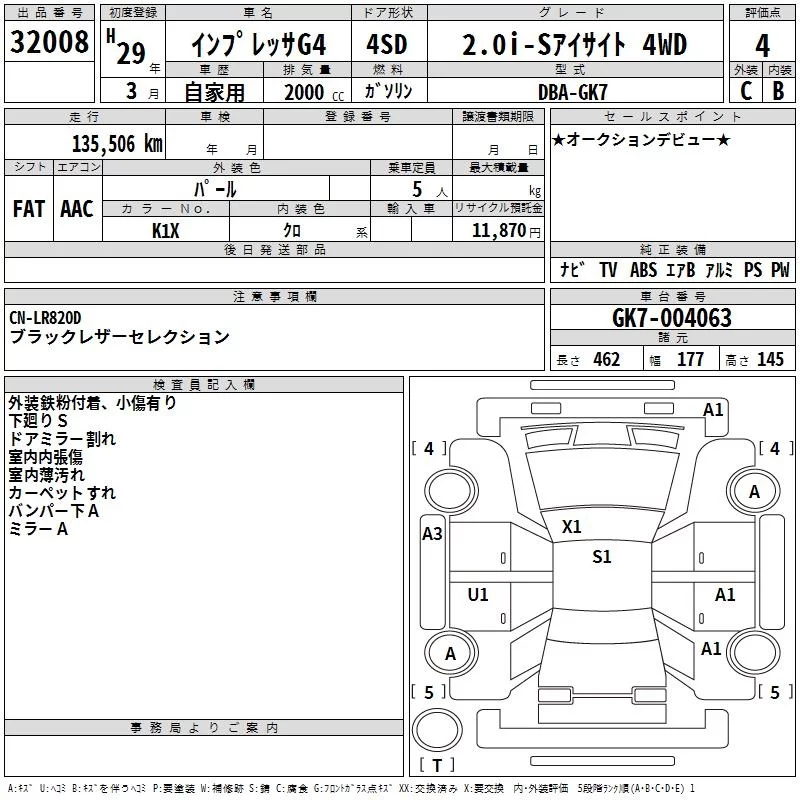 Subaru IMPREZA G4 с аукциона Японии TAA Kinki лот № 32008