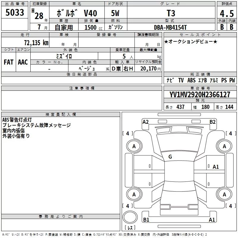 Volvo V40 с аукциона Японии TAA Kinki лот № 5033
