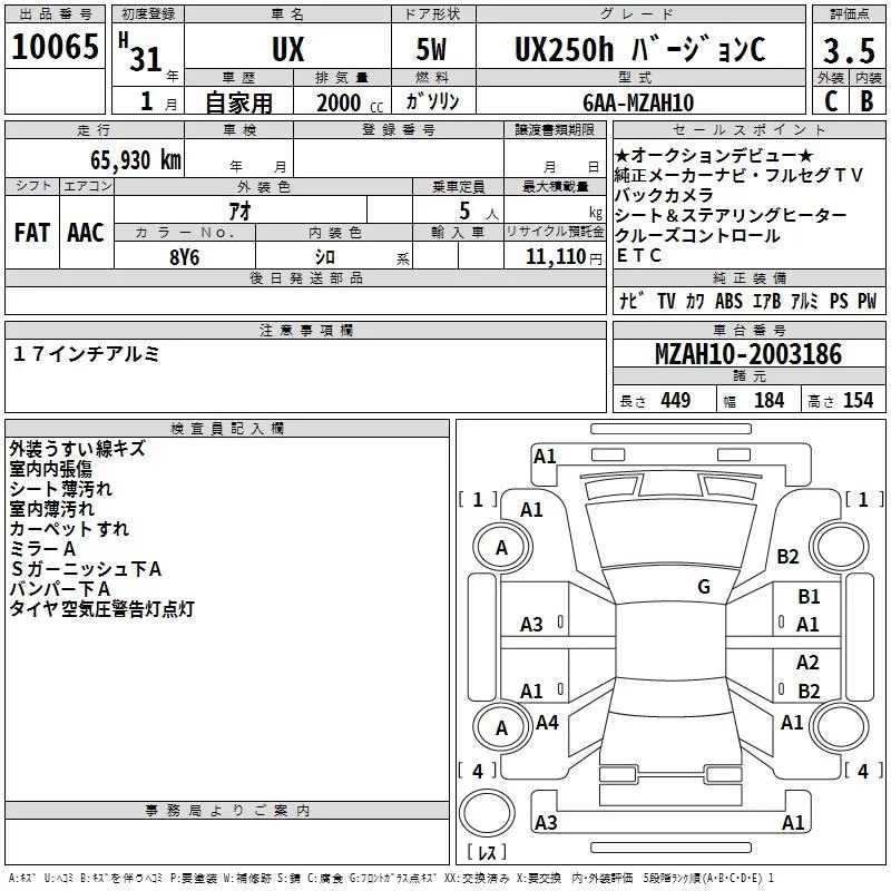 Lexus UX с аукциона Японии TAA Kinki лот № 10065