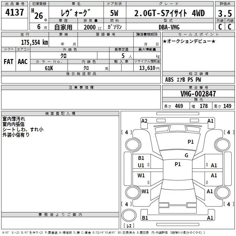Subaru LEVORG с аукциона Японии TAA Hiroshima лот № 4137