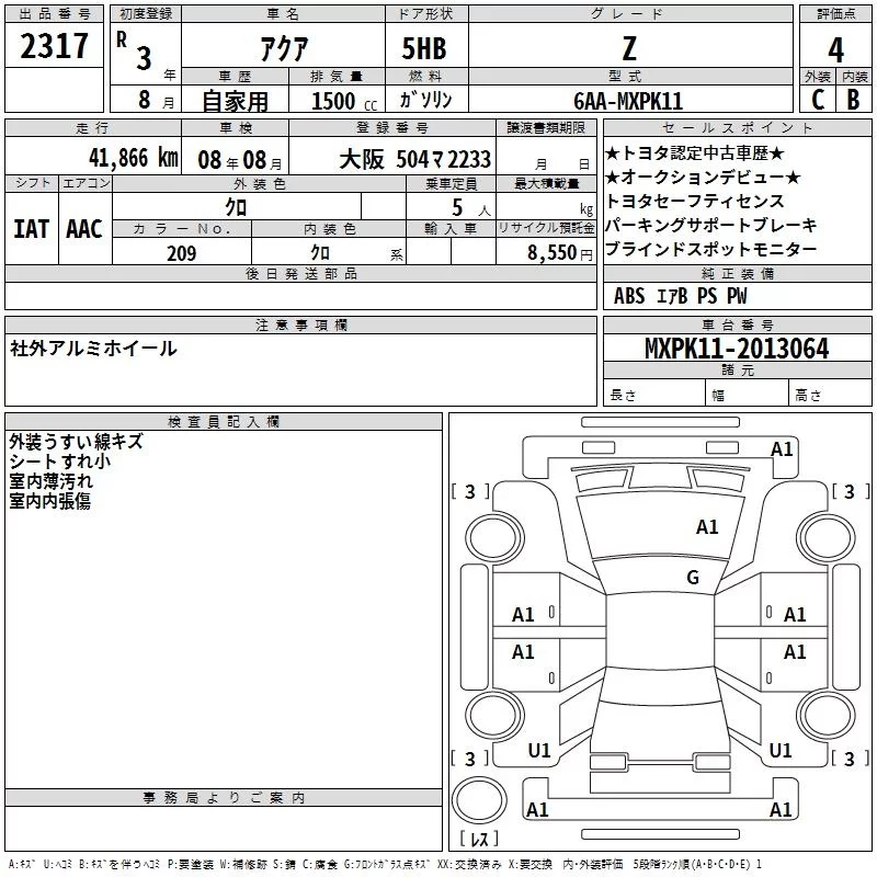 Toyota AQUA с аукциона Японии TAA Kinki лот № 2317