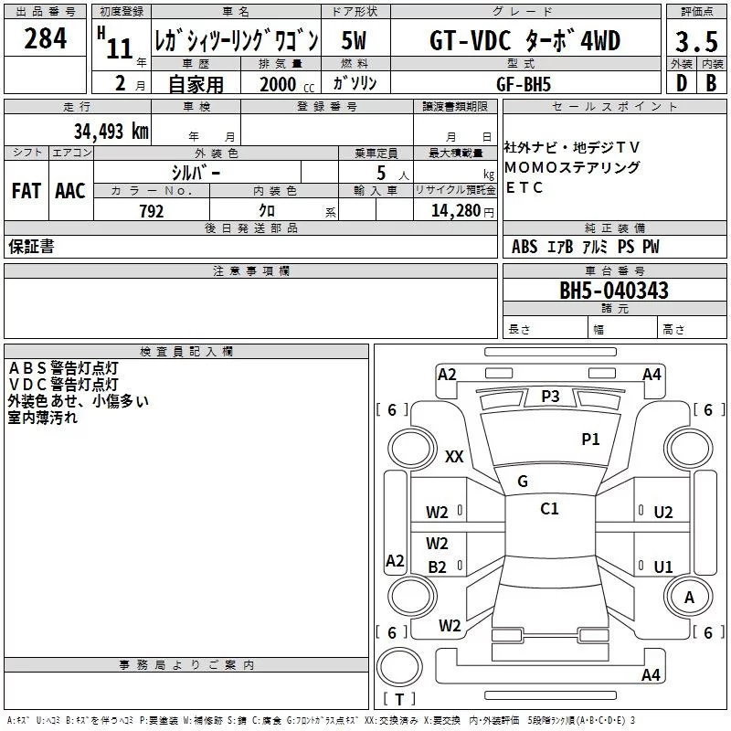 Subaru LEGACY с аукциона Японии TAA Kinki лот № 284