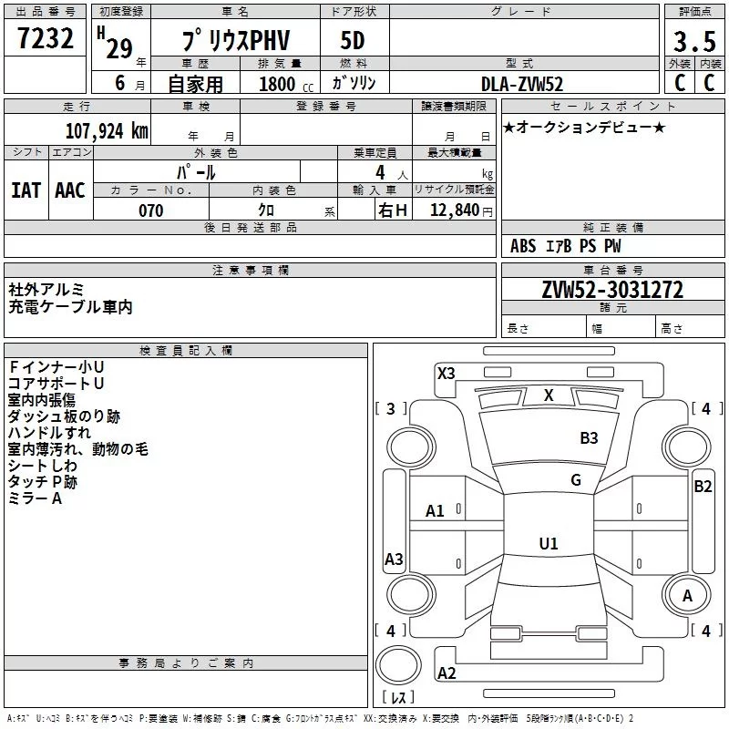 Toyota PRIUS PHV с аукциона Японии TAA Kinki лот № 7232