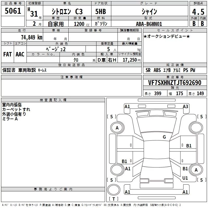 Citroen C3 с аукциона Японии TAA Kinki лот № 5061