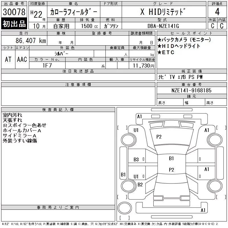 Toyota COROLLA FIELDER с аукциона Японии CAA Tokyo лот № 30078