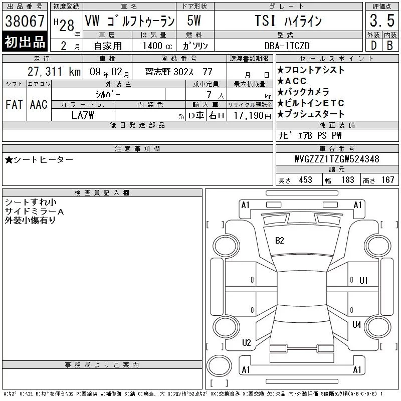 Volkswagen GOLF TOURAN с аукциона Японии CAA Tokyo лот № 38067