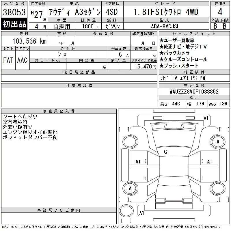 Audi A3 с аукциона Японии CAA Tokyo лот № 38053