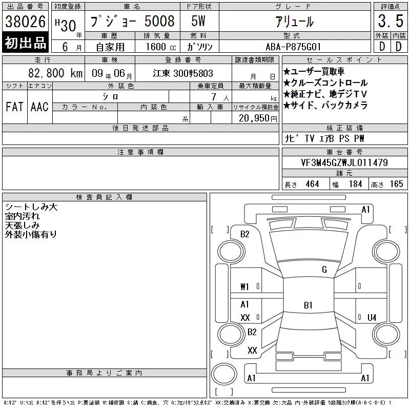 Peugeot 5008 с аукциона Японии CAA Tokyo лот № 38026