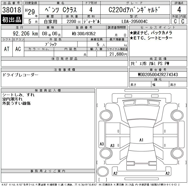 Mercedes-Benz C CLASS с аукциона Японии CAA Tokyo лот № 38018