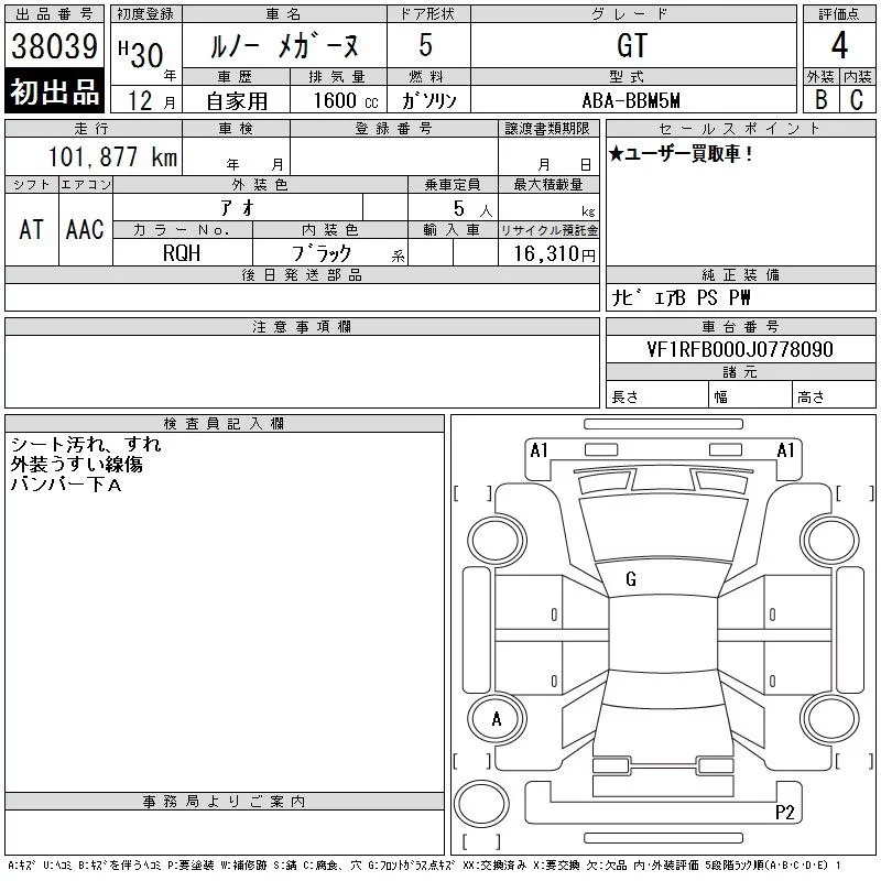Renault MEGANE с аукциона Японии CAA Tokyo лот № 38039