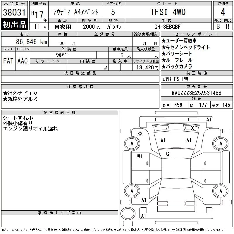 Audi A4 с аукциона Японии CAA Tokyo лот № 38031