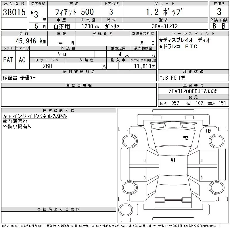 Fiat 500 с аукциона Японии CAA Tokyo лот № 38015