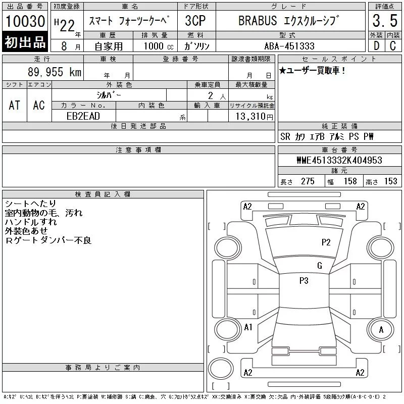 Smart FORTWO с аукциона Японии CAA Tokyo лот № 10030