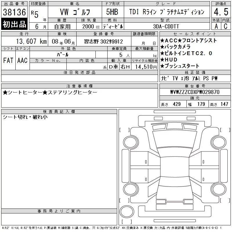 Volkswagen GOLF с аукциона Японии CAA Tokyo лот № 38136