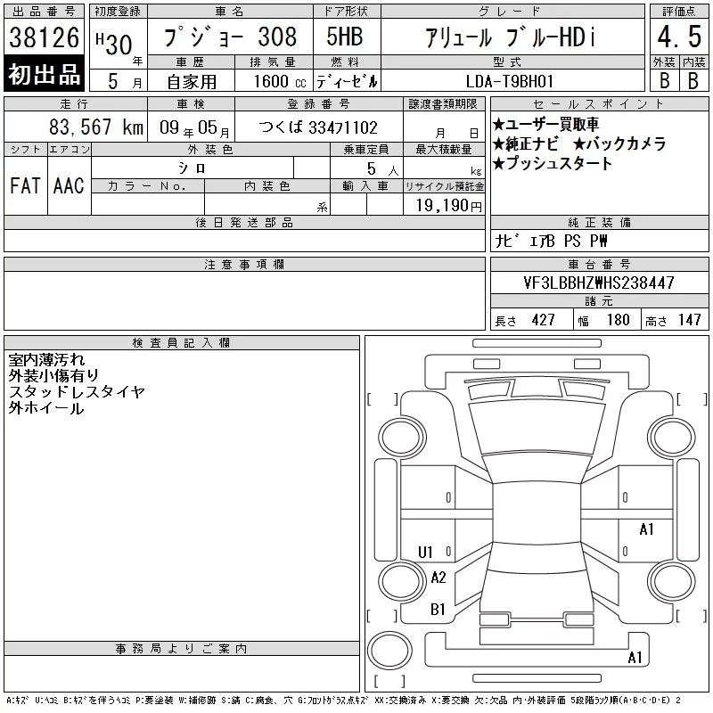 Peugeot 308 с аукциона Японии CAA Tokyo лот № 38126