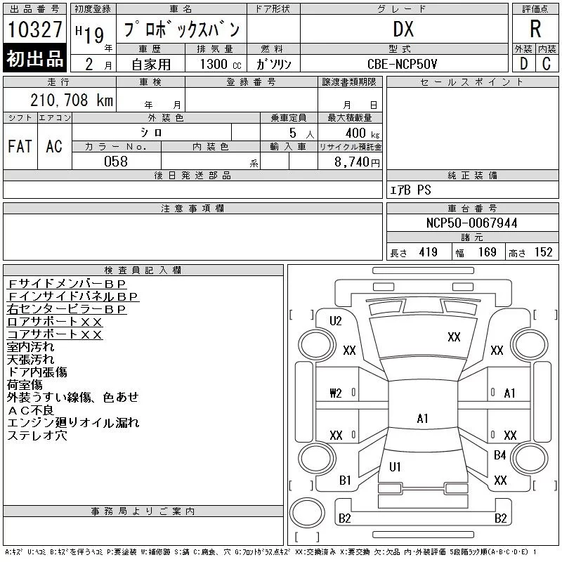 Toyota PROBOX с аукциона Японии CAA Tokyo лот № 10327